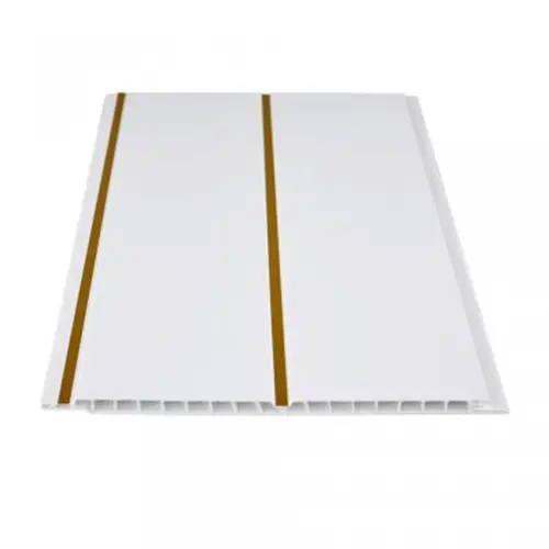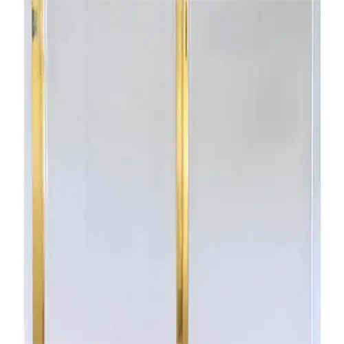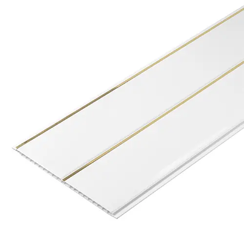 Двухсекционная панель пвх с золотой вставкой- это отличная альтернатива металлическому реечному потолку. Панель легко монтируется, что значительно упрощает процесс установки. Кроме того, она легко моется, что делает ее идеальным выбором для помещений с высокой влажностью, таких как ванная или кухня.