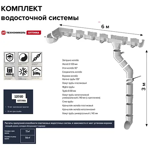 - Полный комплект: Включает все необходимые элементы, включая крепежные саморезы для кронштейнов, хомутов и воронки.