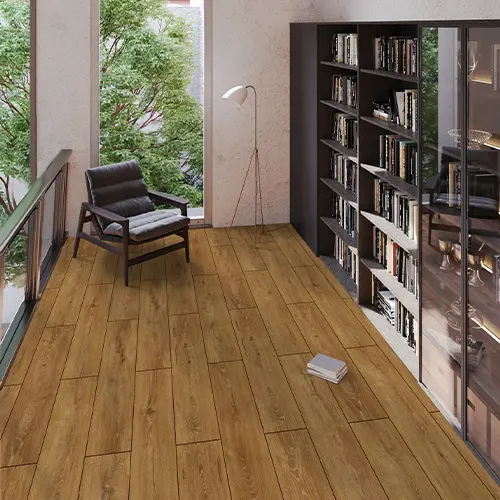 Коллекция представляет насыщенный коричневый оттенок дуба с благородным золотистым подтоном. Выразительная текстура древесины и рельефная поверхность создают впечатление дорогого паркетного покрытия, придавая интерьеру особый шарм и теплоту.