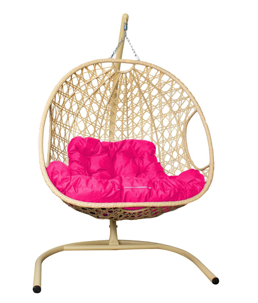 Подвесное кресло ДЛЯ ДВОИХ ЛЮКС с ротангом бежевое, розовая подушка