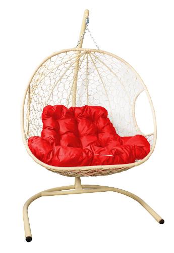 Подвесное кресло ДЛЯ ДВОИХ с ротангом бежевое, красная подушка