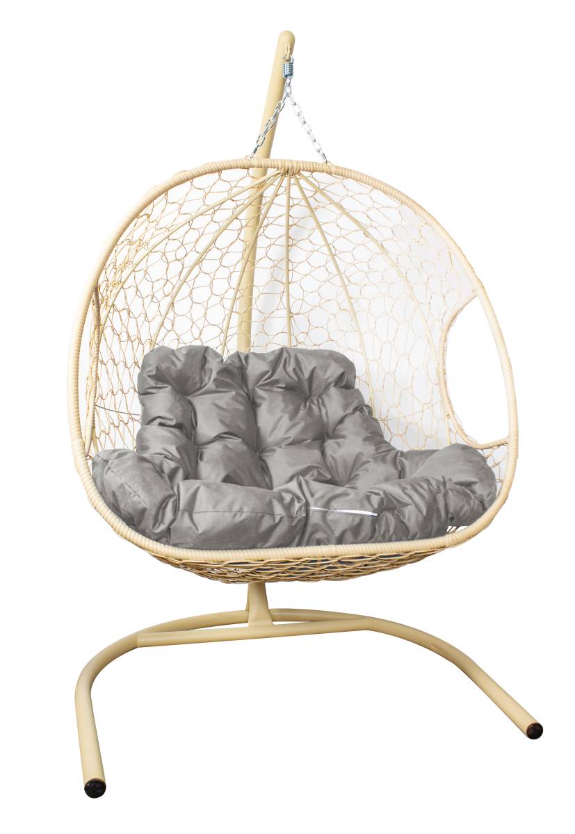 Подвесное кресло ДЛЯ ДВОИХ с ротангом бежевое, серая подушка