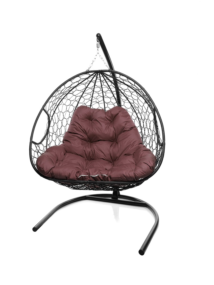 Подвесное кресло ДЛЯ ДВОИХ с ротангом чёрное, бордовая подушка