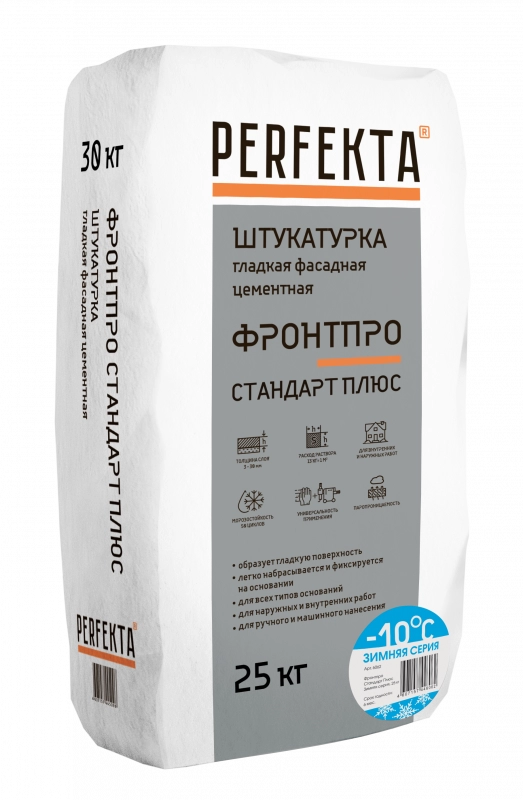 Штукатурка фасадная PERFEKTA® ФронтПро Стандарт PLUS Зимняя серия предназначена для выполнения работ при отрицательных температурах по выравниванию стен внутри и снаружи зданий (фасадов, подвалов и помещений с любой степенью влажности).