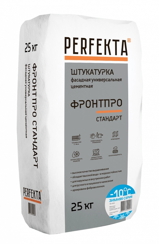 Штукатурка фасадная PERFEKTA® ФронтПро Стандарт Зимняя серия предназначена для выполнения работ при отрицательных температурах по выравниванию стен внутри и снаружи зданий (фасадов, подвалов и помещений с любой степенью влажности).