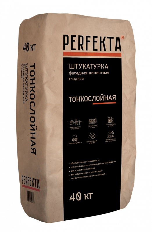 Штукатурка фасадная гладкая PERFEKTA® Тонкослойная МН предназначена для высококачественного тонкослойного выравнивания стен внутри и снаружи зданий. Может применяться для предварительного выравнивания потолков, для заделки трещин, выбоин и углублений.