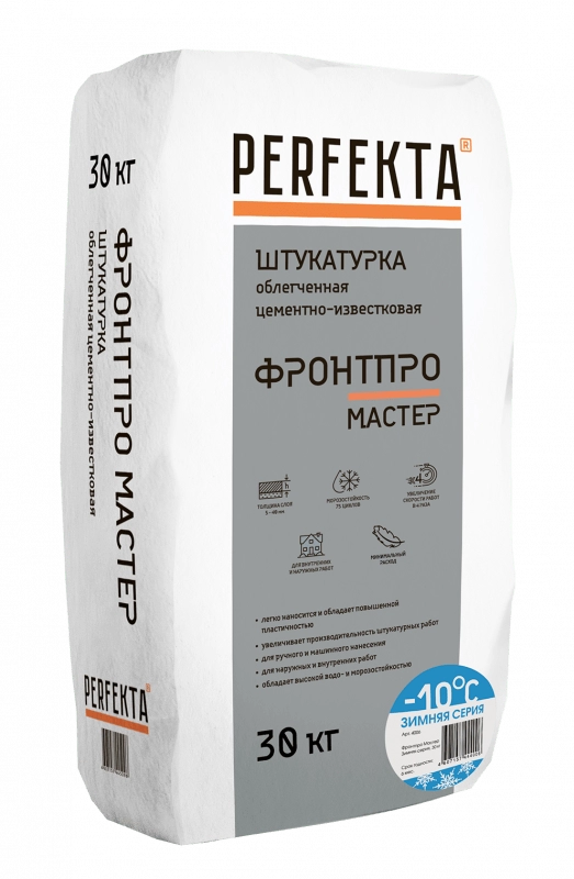 Штукатурка фасадная облегченная PERFEKTA® Фронтпро Мастер Зимняя серия предназначена для выполнения работ при отрицательных температурах по выравниванию стен внутри и снаружи зданий (фасадов, подвалов и помещений с любой степенью влажности). Создает, после высыхания, прочный паропроницаемый и трещиностойкий слой.