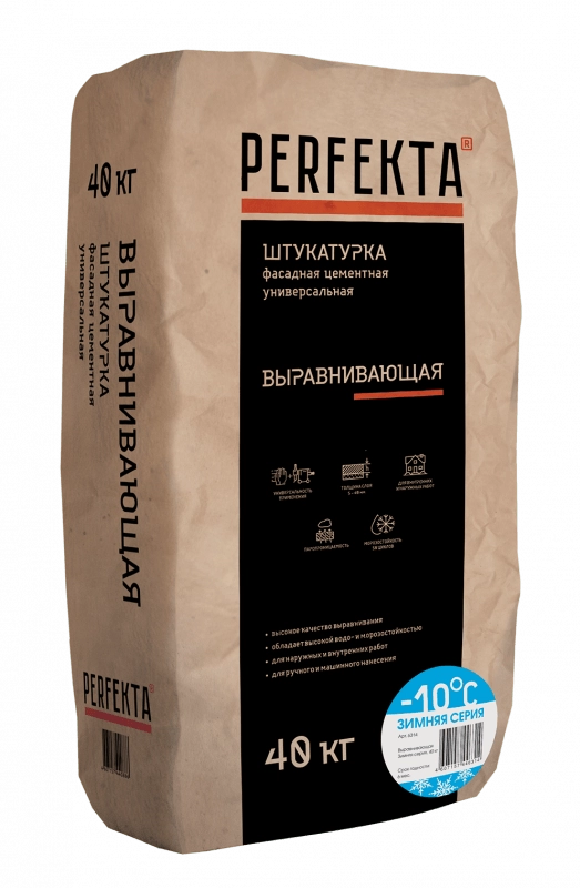 Штукатурка фасадная PERFEKTA® Выравнивающая Зимняя серия предназначена для выполнения при отрицательных температурах работ по предварительному выравниванию стен внутри и снаружи зданий. Применяется как для однослойного выравнивания, так и в качестве “обрызга” и “грунта” в многослойных штукатурных системах.