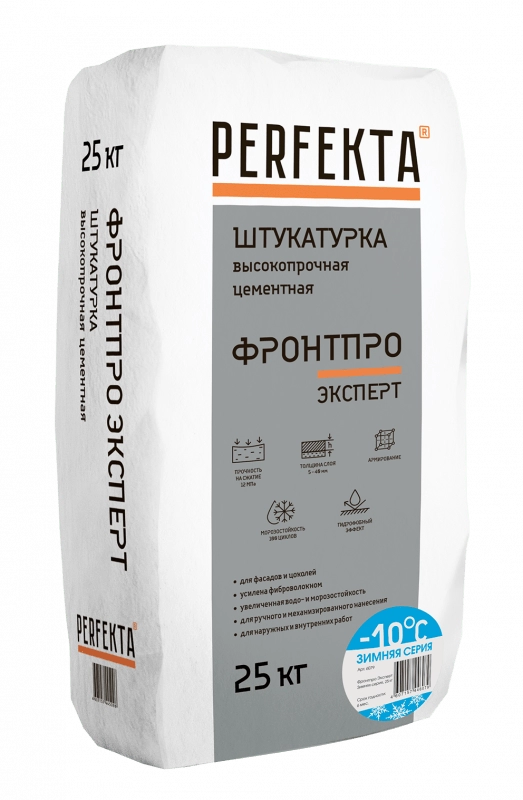 Штукатурка высокопрочная цементная PERFEKTA® ФронтПро Эксперт Зимняя серия предназначена для выполнения работ при отрицательных температурах по выравниванию стен внутри и снаружи зданий (фасадов, цоколей, террас, подвалов и помещений с любой степенью влажности).