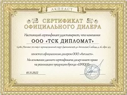 Надежность нашей компании, как поставщика высококачественных строительных материалов подтверждена не только продолжительностью и постоянством контактов, но и соответствующими дилерскими сертификатами.
